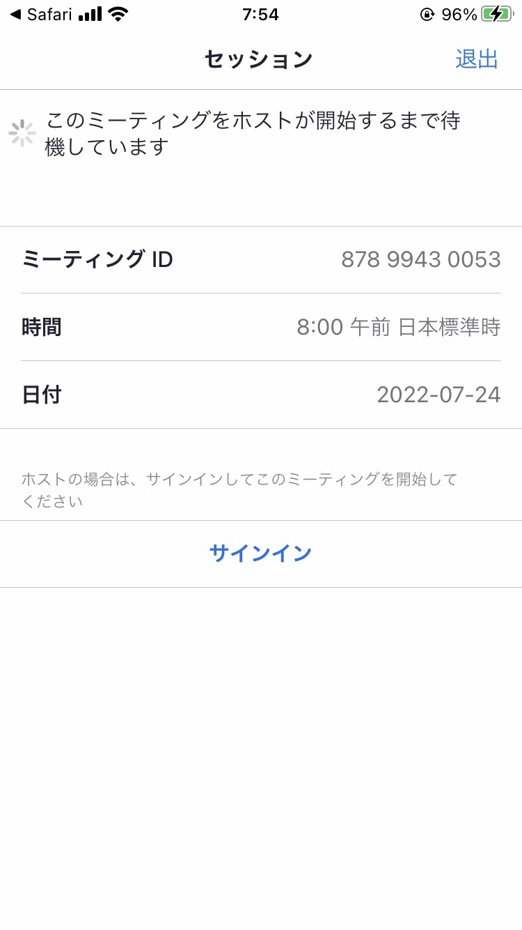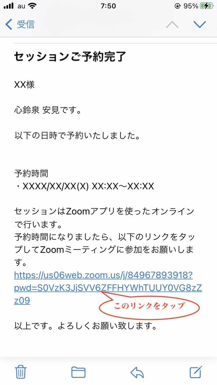 予約時間になりましたら、こちらから送信した受付完了メールに記載されている以下のリンクをタップして、Zoomアプリを開いてください。